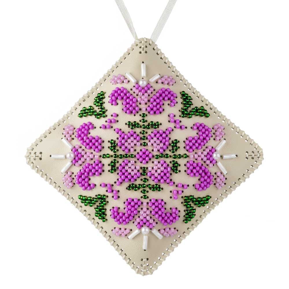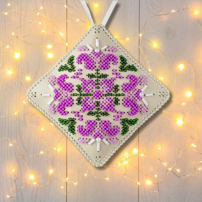 This set includes everything you need to create a sparkling two-sided ornament on durable faux leather. Once embroidered with shimmering Preciosa beads, the two halves are stitched together, filled with soft padding, and finished with a decorative ribbon — ready to hang on your Christmas tree or gift to someone special.