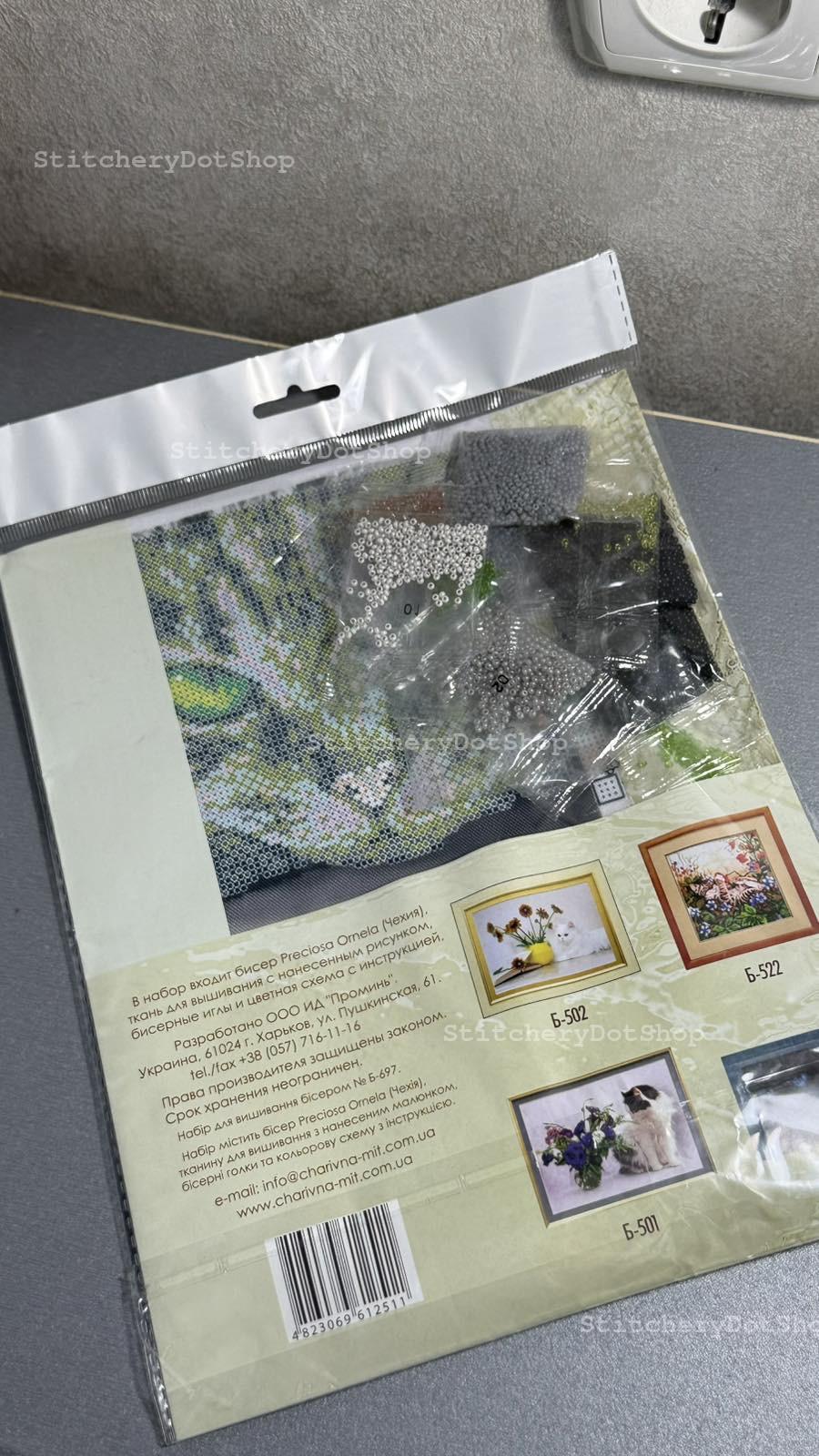 The kit contains: Preciosa beads – 12 colors, printed embroidery cloth, beaded needle and color pattern with instruction chart.
