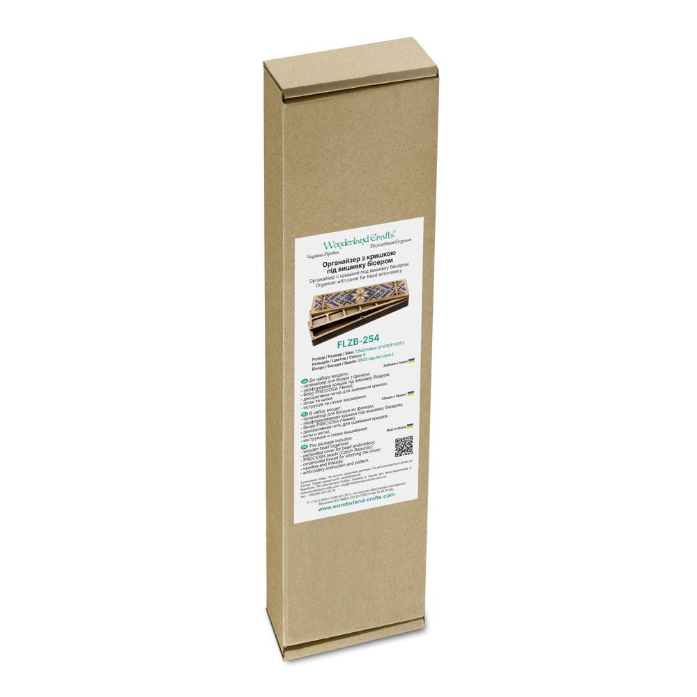 DIY Bead embroidery kit "Ornament" for creating bead organizer tray with a wooden lid.