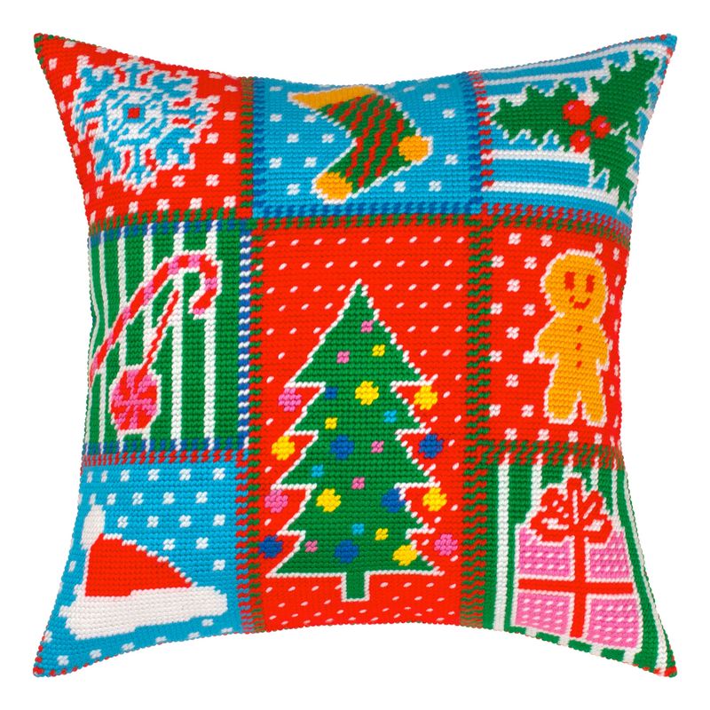 Stitch this patchwork in Christmas colors to enhance your holiday décor with festive symbols