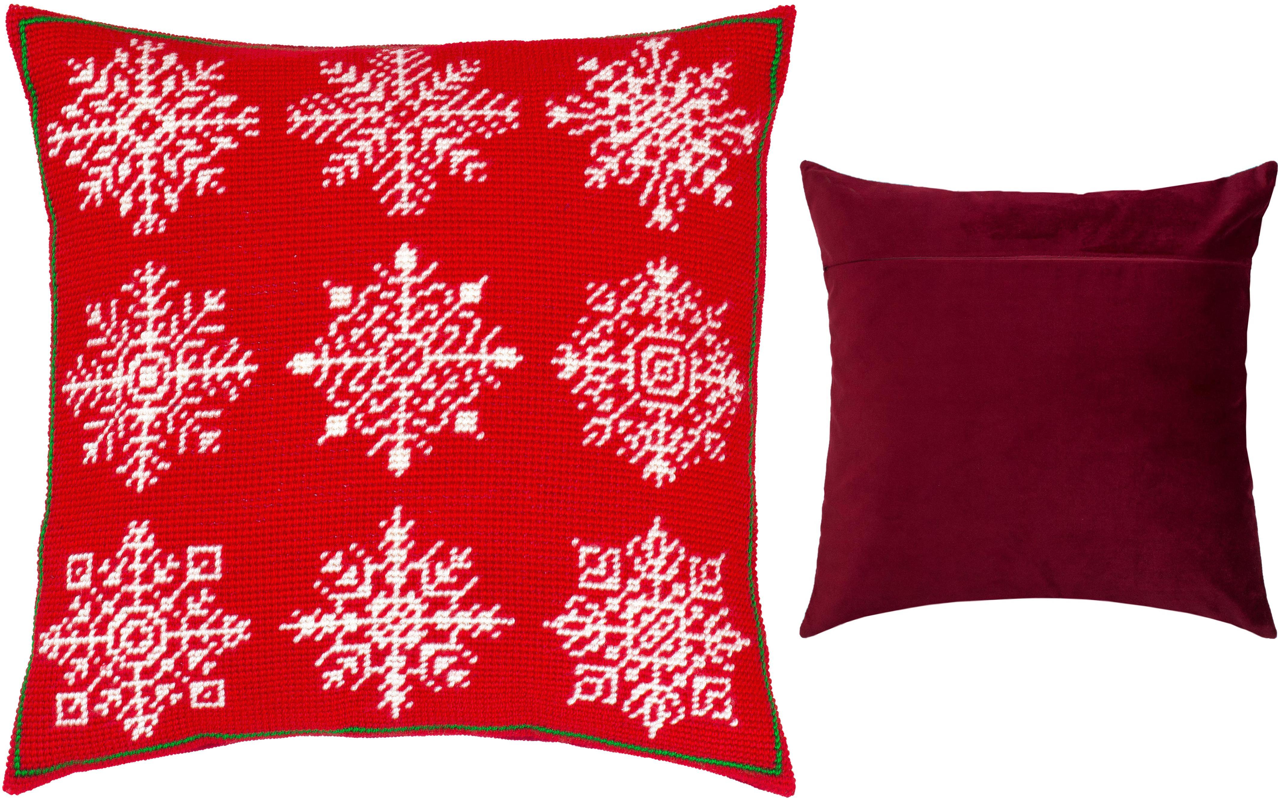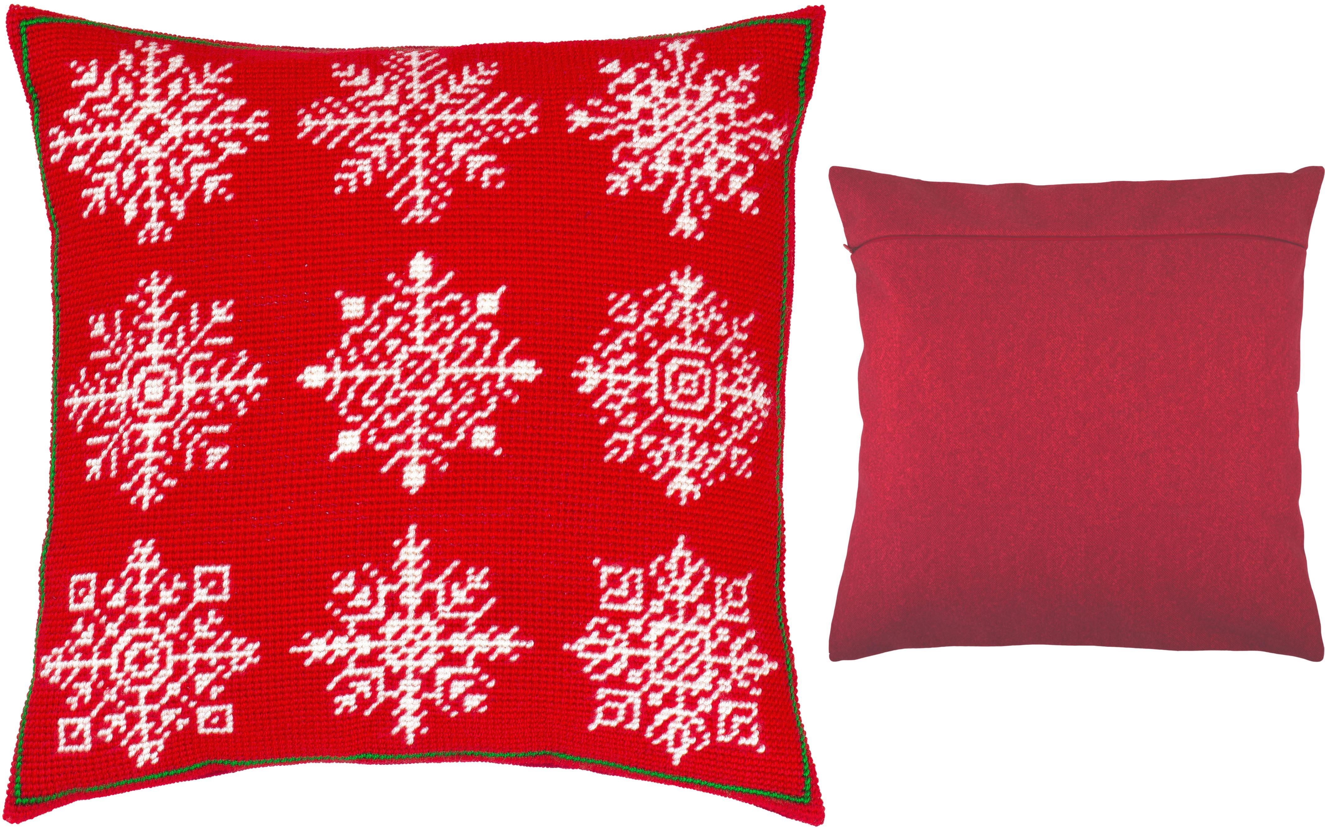 Sticken Sie diese nordischen Schneeflocken auf rotem Hintergrund, um winterliche Stimmung in Ihr Zuhause zu bringen