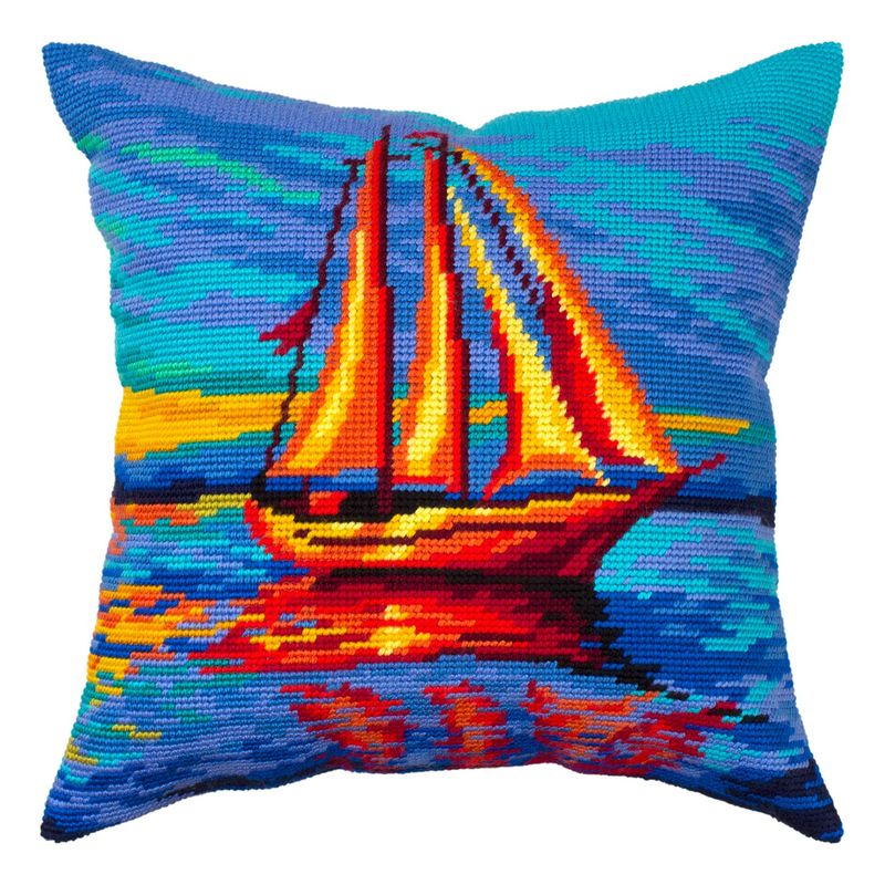 Stitch this stunning view of a sailing ship at sunset to add plenty of color to your home décor.